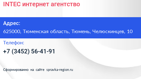 INTEC, интернет-агентство по адресу 625000, Тюменская область, Тюмень, Челюскинцев, 10 в дальнейшем Организация, размещена в следующих категориях: