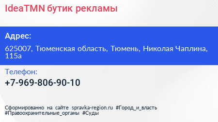 IdeaTMN, бутик рекламы по адресу 625007, Тюменская область, Тюмень, Николая Чаплина, 115а в дальнейшем Организация, размещена в следующих категориях: