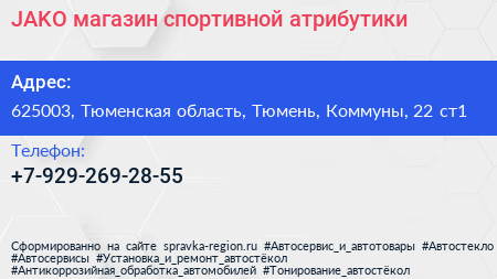 JAKO, магазин спортивной атрибутики по адресу 625003, Тюменская область, Тюмень, Коммуны, 22 ст1 в дальнейшем Организация, размещена в следующих категориях: