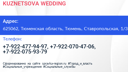 KUZNETSOVA WEDDING по адресу 625062, Тюменская область, Тюмень, Ставропольская, 1/3 в дальнейшем Организация, размещена в следующих категориях: