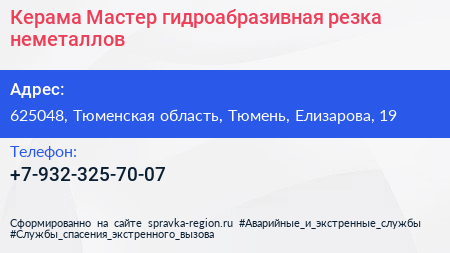Керама Мастер, гидроабразивная резка неметаллов по адресу 625048, Тюменская область, Тюмень, Елизарова, 19 в дальнейшем Организация, размещена в следующих категориях: