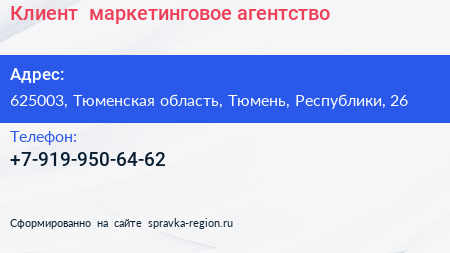 Клиент+, маркетинговое агентство по адресу 625003, Тюменская область, Тюмень, Республики, 26 в дальнейшем Организация, размещена в следующих категориях: