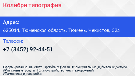 Колибри, типография по адресу 625014, Тюменская область, Тюмень, Чекистов, 32а в дальнейшем Организация, размещена в следующих категориях: