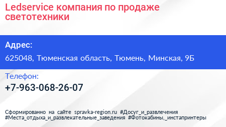 Ledservice, компания по продаже светотехники по адресу 625048, Тюменская область, Тюмень, Минская, 9Б в дальнейшем Организация, размещена в следующих категориях: