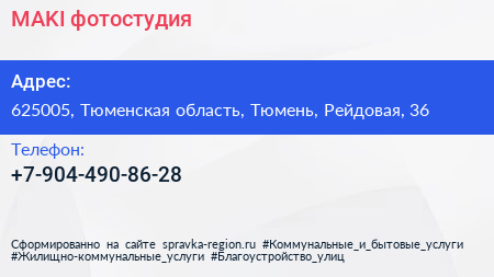 MAKI, фотостудия по адресу 625005, Тюменская область, Тюмень, Рейдовая, 36 в дальнейшем Организация, размещена в следующих категориях:
