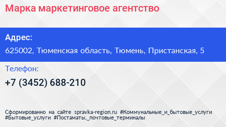 Марка, маркетинговое агентство по адресу 625002, Тюменская область, Тюмень, Пристанская, 5 в дальнейшем Организация, размещена в следующих категориях: