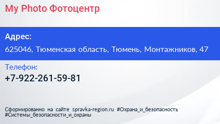 My Photo, Фотоцентр по адресу 625046, Тюменская область, Тюмень, Монтажников, 47 в дальнейшем Организация, размещена в следующих категориях: