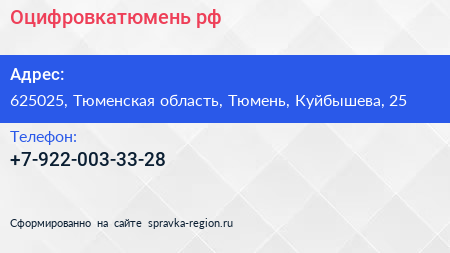 Оцифровкатюмень.рф по адресу 625025, Тюменская область, Тюмень, Куйбышева, 25 в дальнейшем Организация, размещена в следующих категориях: