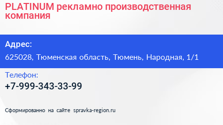 PLATINUM, рекламно-производственная компания по адресу 625028, Тюменская область, Тюмень, Народная, 1/1 в дальнейшем Организация, размещена в следующих категориях: