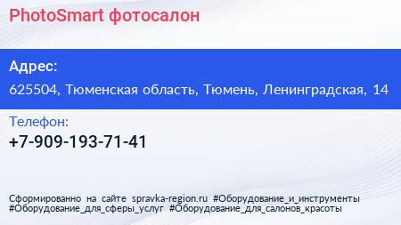PhotoSmart, фотосалон по адресу 625504, Тюменская область, Тюмень, Ленинградская, 14 в дальнейшем Организация, размещена в следующих категориях: