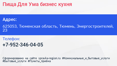 Пища Для Ума, бизнес-кухня по адресу 625053, Тюменская область, Тюмень, Энергостроителей, 23 в дальнейшем Организация, размещена в следующих категориях:
