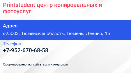 Printstudent, центр копировальных и фотоуслуг по адресу 625003, Тюменская область, Тюмень, Ленина, 15 в дальнейшем Организация, размещена в следующих категориях:
