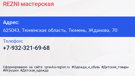 REZNI, мастерская по адресу 625043, Тюменская область, Тюмень, Жданова, 70 в дальнейшем Организация, размещена в следующих категориях: