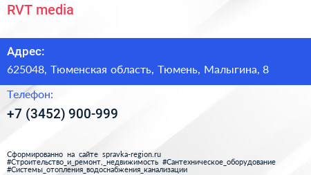 RVT media по адресу 625048, Тюменская область, Тюмень, Малыгина, 8 в дальнейшем Организация, размещена в следующих категориях: