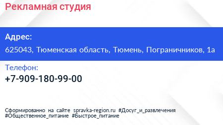 Рекламная студия по адресу 625043, Тюменская область, Тюмень, Пограничников, 1а в дальнейшем Организация, размещена в следующих категориях:
