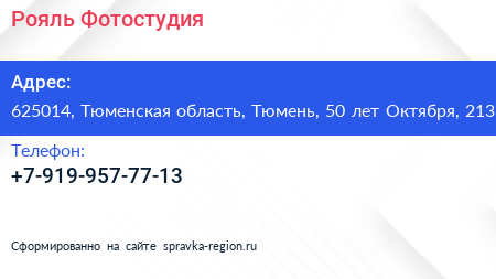 Рояль, Фотостудия по адресу 625014, Тюменская область, Тюмень, 50 лет Октября, 213 в дальнейшем Организация, размещена в следующих категориях: