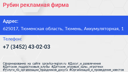 Рубин, рекламная фирма по адресу 625017, Тюменская область, Тюмень, Аккумуляторная, 1 в дальнейшем Организация, размещена в следующих категориях: