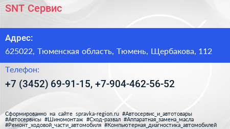 SNT Сервис по адресу 625022, Тюменская область, Тюмень, Щербакова, 112 в дальнейшем Организация, размещена в следующих категориях: