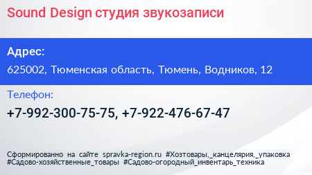 Sound Design, студия звукозаписи по адресу 625002, Тюменская область, Тюмень, Водников, 12 в дальнейшем Организация, размещена в следующих категориях: