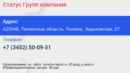 Статус Групп, компания по адресу 625048, Тюменская область, Тюмень, Харьковская, 27 в дальнейшем Организация, размещена в следующих категориях: