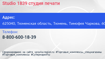 Studio 1839, студия печати по адресу 625040, Тюменская область, Тюмень, Тимофея Чаркова, 60 в дальнейшем Организация, размещена в следующих категориях: