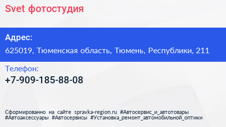 Svet, фотостудия по адресу 625019, Тюменская область, Тюмень, Республики, 211 в дальнейшем Организация, размещена в следующих категориях: