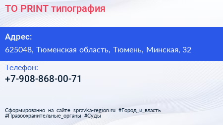 TO PRINT!, типография по адресу 625048, Тюменская область, Тюмень, Минская, 32 в дальнейшем Организация, размещена в следующих категориях:
