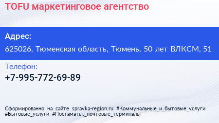 TOFU, маркетинговое агентство по адресу 625026, Тюменская область, Тюмень, 50 лет ВЛКСМ, 51 в дальнейшем Организация, размещена в следующих категориях: