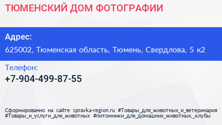 ТЮМЕНСКИЙ ДОМ ФОТОГРАФИИ по адресу 625002, Тюменская область, Тюмень, Свердлова, 5 к2 в дальнейшем Организация, размещена в следующих категориях: