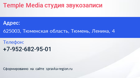 Temple Media, студия звукозаписи по адресу 625003, Тюменская область, Тюмень, Ленина, 4 в дальнейшем Организация, размещена в следующих категориях: