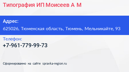 Типография, ИП Моисеев А.М. по адресу 625026, Тюменская область, Тюмень, Мельникайте, 93 в дальнейшем Организация, размещена в следующих категориях: