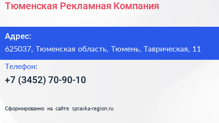 Тюменская Рекламная Компания по адресу 625037, Тюменская область, Тюмень, Таврическая, 11 в дальнейшем Организация, размещена в следующих категориях: