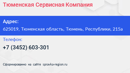 Тюменская Сервисная Компания+ по адресу 625019, Тюменская область, Тюмень, Республики, 215а в дальнейшем Организация, размещена в следующих категориях: