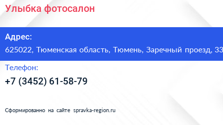 Улыбка, фотосалон по адресу 625022, Тюменская область, Тюмень, Заречный проезд, 33 в дальнейшем Организация, размещена в следующих категориях: