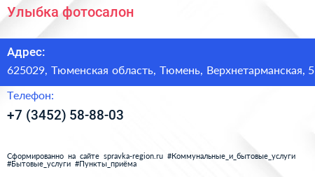 Улыбка, фотосалон по адресу 625029, Тюменская область, Тюмень, Верхнетарманская, 5 в дальнейшем Организация, размещена в следующих категориях: