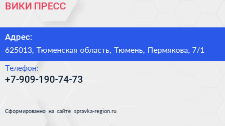 ВИКИ-ПРЕСС по адресу 625013, Тюменская область, Тюмень, Пермякова, 7/1 в дальнейшем Организация, размещена в следующих категориях: