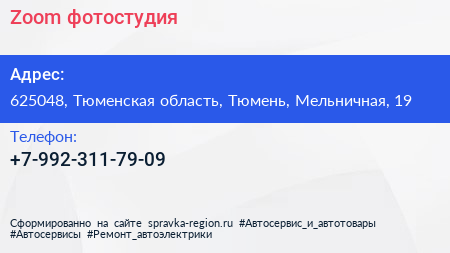 Zoom, фотостудия по адресу 625048, Тюменская область, Тюмень, Мельничная, 19 в дальнейшем Организация, размещена в следующих категориях: