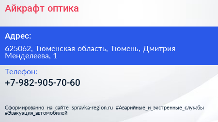 Айкрафт оптика по адресу 625062, Тюменская область, Тюмень, Дмитрия Менделеева, 1 в дальнейшем Организация, размещена в следующих категориях: