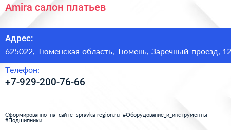 Amira, салон платьев по адресу 625022, Тюменская область, Тюмень, Заречный проезд, 12 в дальнейшем Организация, размещена в следующих категориях: