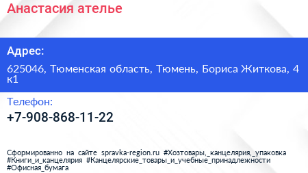 Анастасия, ателье по адресу 625046, Тюменская область, Тюмень, Бориса Житкова, 4 к1 в дальнейшем Организация, размещена в следующих категориях: