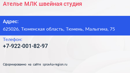 Ателье МЛК, швейная студия по адресу 625026, Тюменская область, Тюмень, Малыгина, 75 в дальнейшем Организация, размещена в следующих категориях: