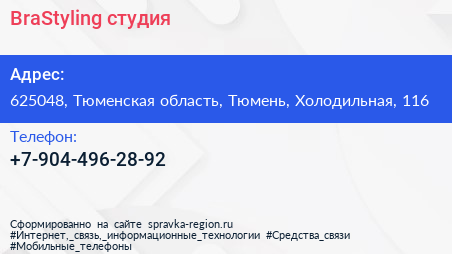 BraStyling, студия по адресу 625048, Тюменская область, Тюмень, Холодильная, 116 в дальнейшем Организация, размещена в следующих категориях:
