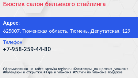 Бюстик, салон бельевого стайлинга по адресу 625007, Тюменская область, Тюмень, Депутатская, 129 в дальнейшем Организация, размещена в следующих категориях: