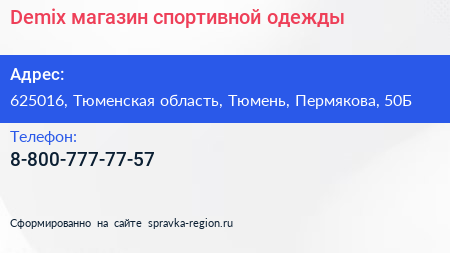 Demix, магазин спортивной одежды по адресу 625016, Тюменская область, Тюмень, Пермякова, 50Б в дальнейшем Организация, размещена в следующих категориях: