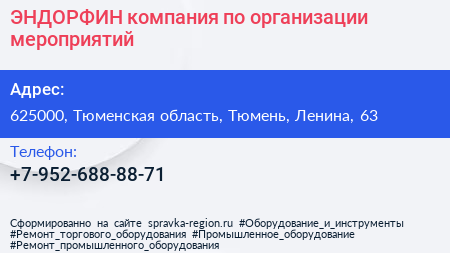 ЭНДОРФИН, компания по организации мероприятий по адресу 625000, Тюменская область, Тюмень, Ленина, 63 в дальнейшем Организация, размещена в следующих категориях: