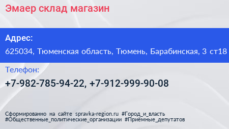 Эмаер, склад-магазин по адресу 625034, Тюменская область, Тюмень, Барабинская, 3 ст18 в дальнейшем Организация, размещена в следующих категориях:
