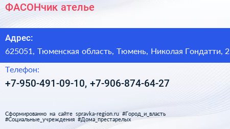 ФАСОНчик, ателье по адресу 625051, Тюменская область, Тюмень, Николая Гондатти, 2 в дальнейшем Организация, размещена в следующих категориях: