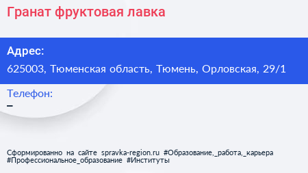 Гранат, фруктовая лавка по адресу 625003, Тюменская область, Тюмень, Орловская, 29/1 в дальнейшем Организация, размещена в следующих категориях: