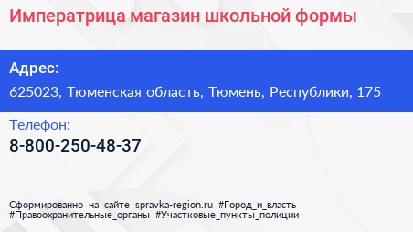 Императрица, магазин школьной формы по адресу 625023, Тюменская область, Тюмень, Республики, 175 в дальнейшем Организация, размещена в следующих категориях: