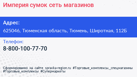 Империя сумок, сеть магазинов по адресу 625046, Тюменская область, Тюмень, Широтная, 112Б в дальнейшем Организация, размещена в следующих категориях: